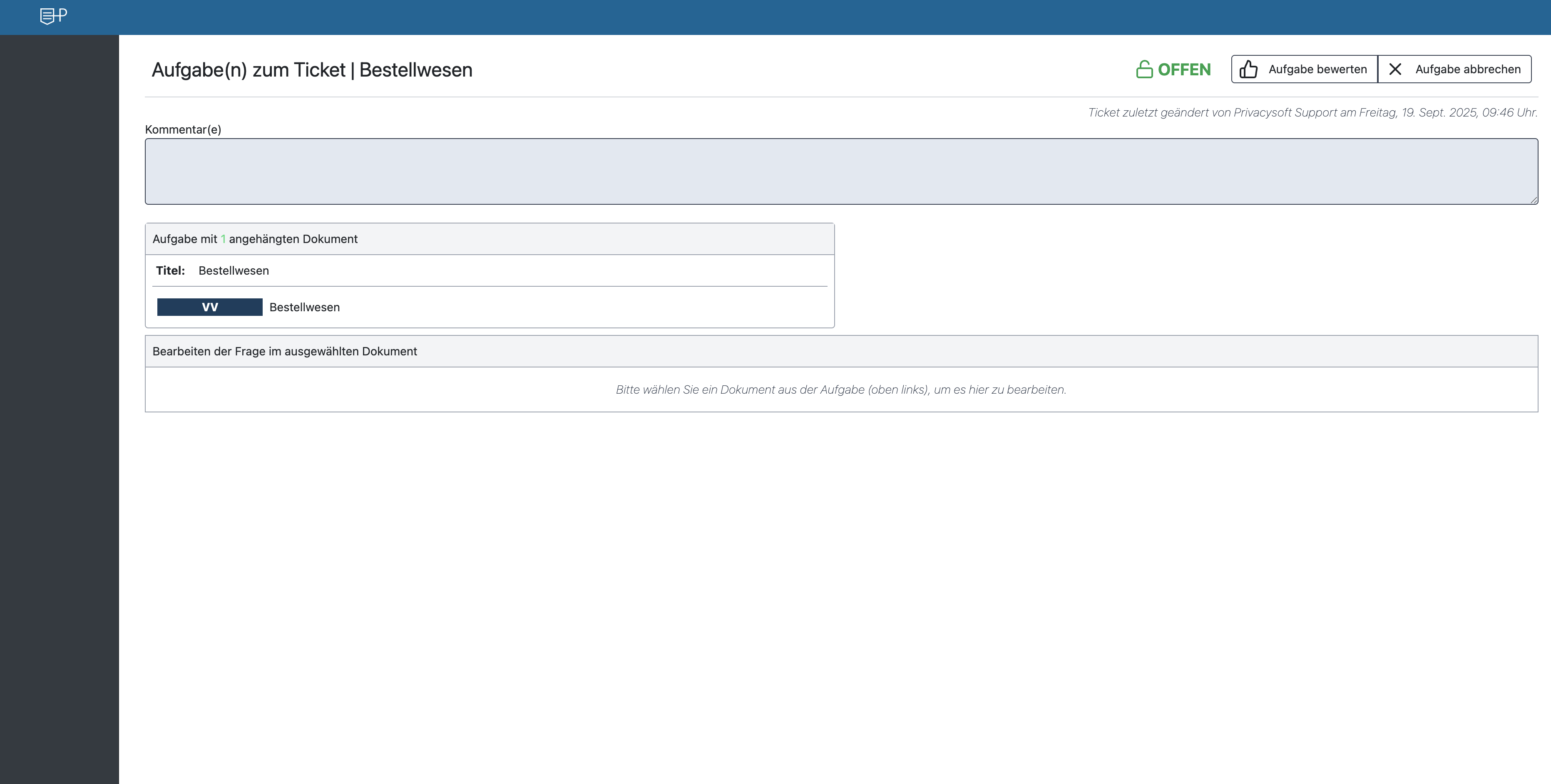 Im Anschluss kann die Bearbeitung des Tickets erfolgen.