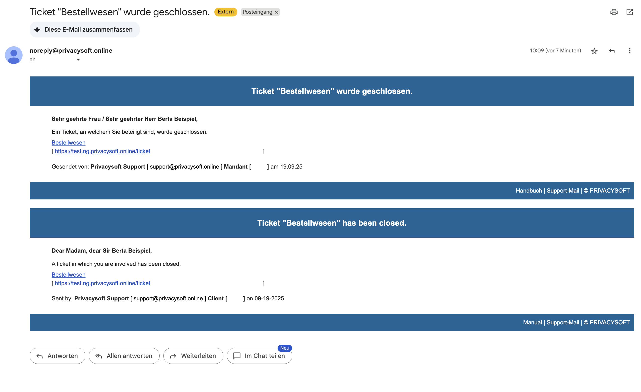 Sobald der Bearbeitende das Ticket geschlossen hat, wird der Erstellende des Tickets eine Benachrichtigung per E-Mail benachrichtigt.