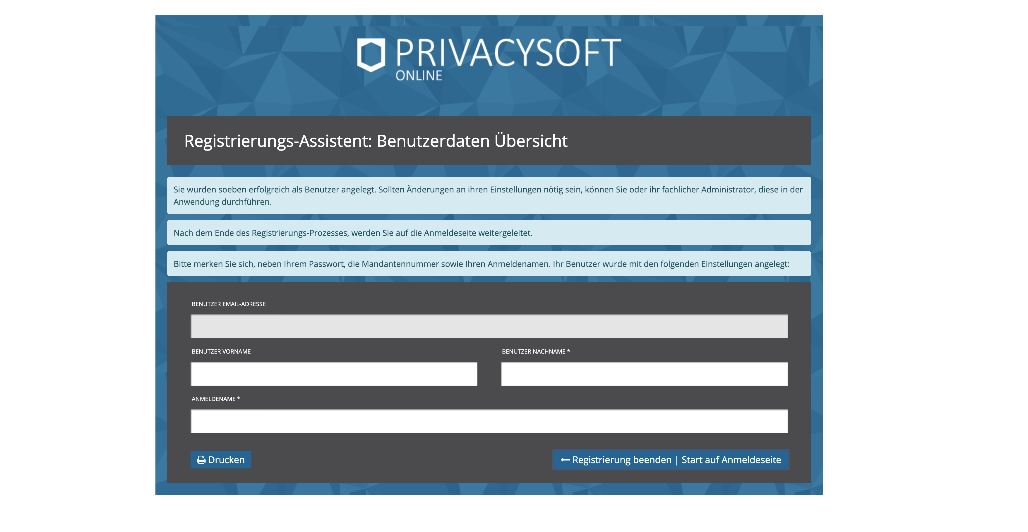 Nach Abschluss der Registrierung erhält der Bearbeitende eine Übersicht über seine Benutzerdaten. Diese können bei Bedarf auch ausgedruckt werden.