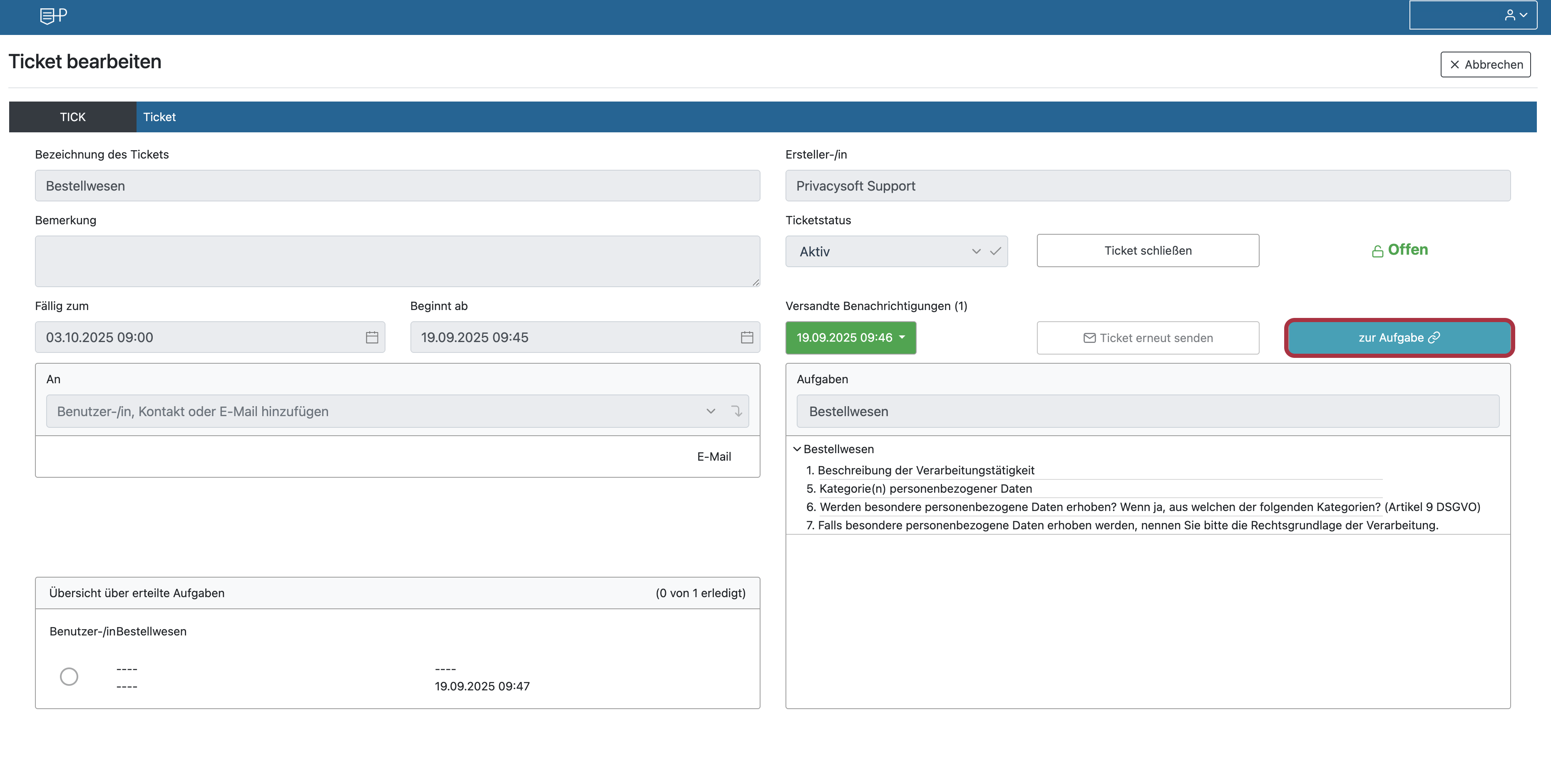Wenn Sie die Aufgabe fertig gestellt haben, können Sie sie speichern, um sie selbst zu bearbeiten oder zu einem späteren Zeitpunkt mit einem Ticket zu versenden, oder Sie können direkt ein Ticket erstellen.