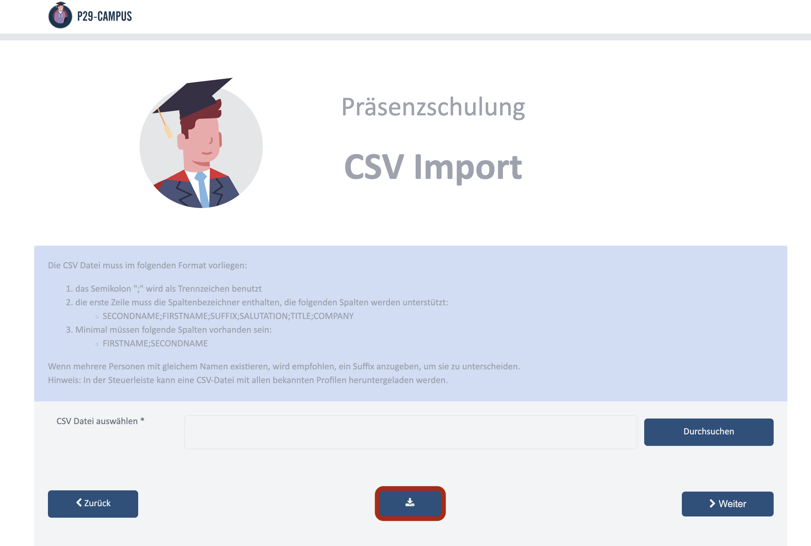 Wichtig: Wenn bereits ein Account im P29 Campus besteht, muss die E-Mail-Adresse in der CSV übereinstimmen, sonst wird kein Bezug zum Benutzerprofil hergestellt.