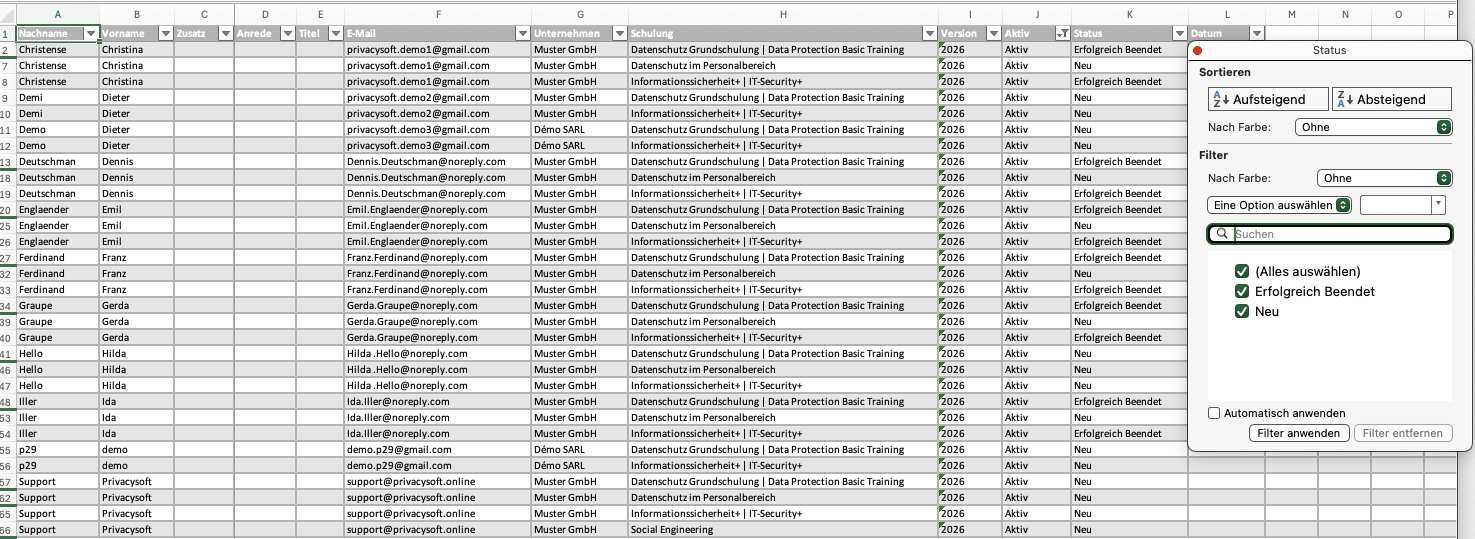 Im Tabellenblatt Report können Sie sich gezielt einen Überblick über den Schulungsstatus einzelner oder mehrerer Schulungen verschaffen. Nutzen Sie dazu den Filter in der Spalte Schulung.