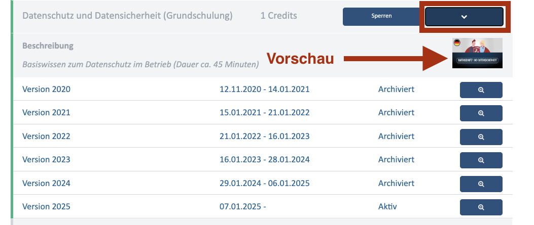Bei jeder Schulung gibt es einen kleinen Pfeil nach unten. Wenn Sie diesen anklicken, öffnet sich eine Ansicht mit zwei nützlichen Funktionen: