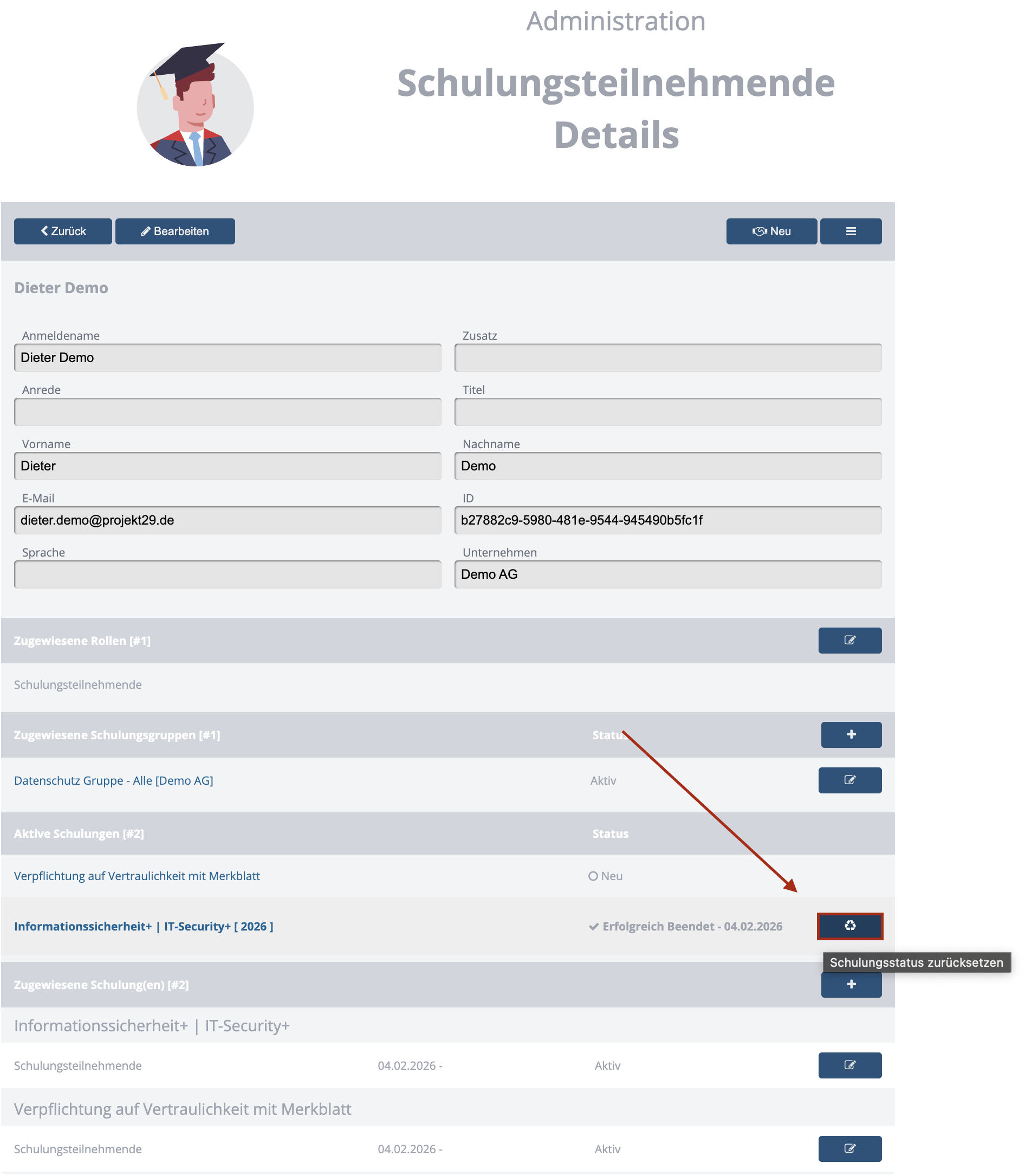 Schulungskoordinatoren und Administratoren können den Schulungsstatus einer teilnehmenden Person zurücksetzen, indem sie in der Detailansicht bei den "Aktiven Schulungen" den dunkelblauen Button bei der jeweiligen Schulung anklickt.