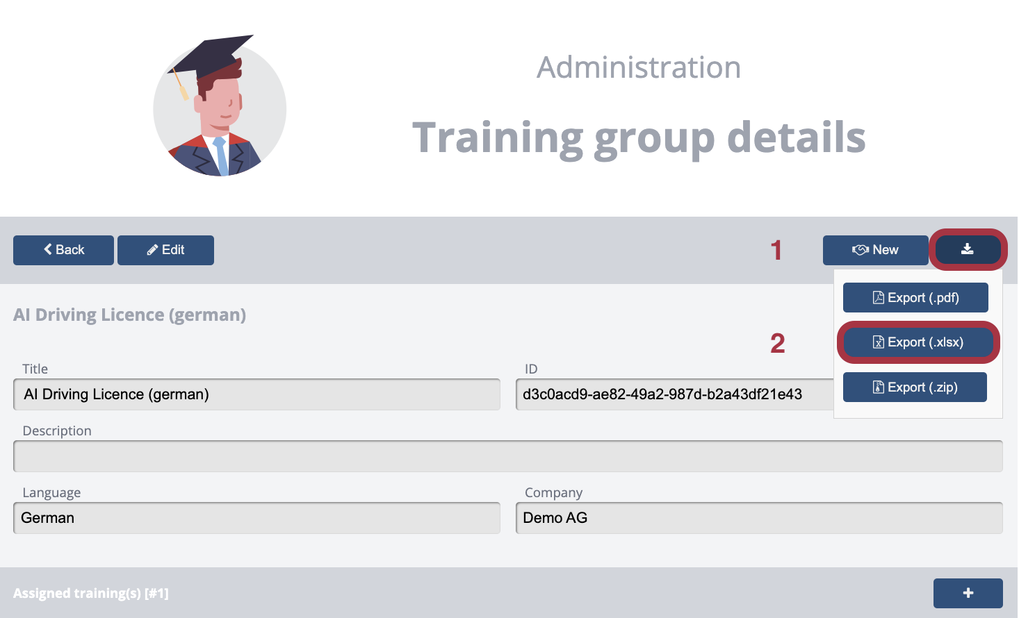 In the group overview, select the group whose participants are to be transferred to another group. Then click on the download arrow in the top right-hand corner and select ‘Export (xlsx)’.