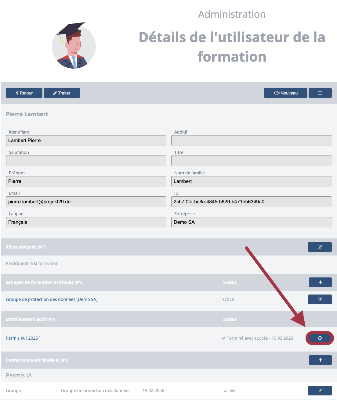 Depuis l'aperçu des participants à la formation, il est possible de passer à la vue détaillée en cliquant sur une entrée.