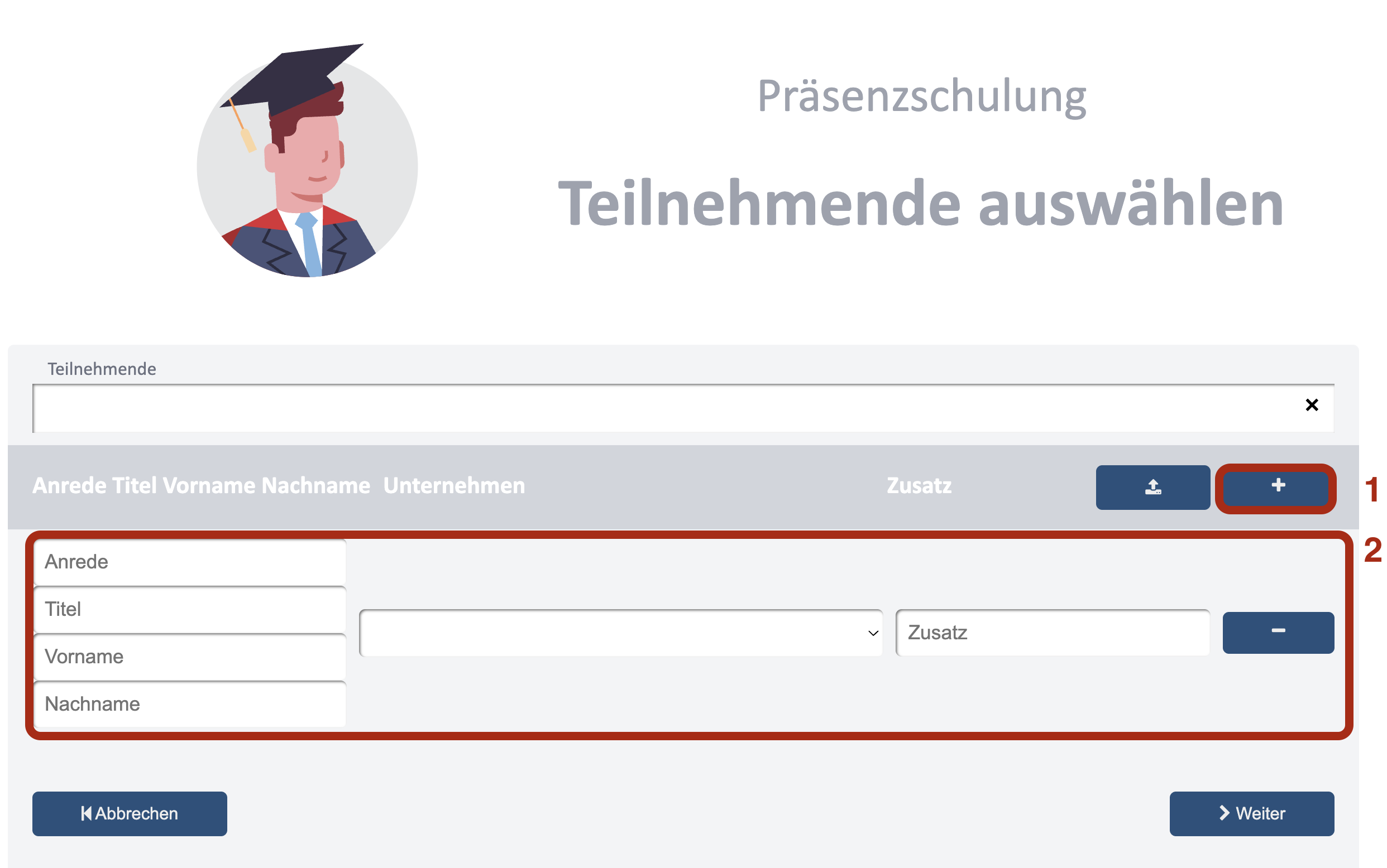 Hinweis: Manuell hinzugefügte Personen erhalten kein Benutzerkonto – sie sind nur für diese Präsenzschulung erfasst. Zur Unterscheidung bei gleichen Namen kann ein Zusatz (Suffix) angegeben werden.