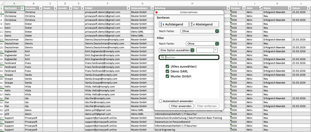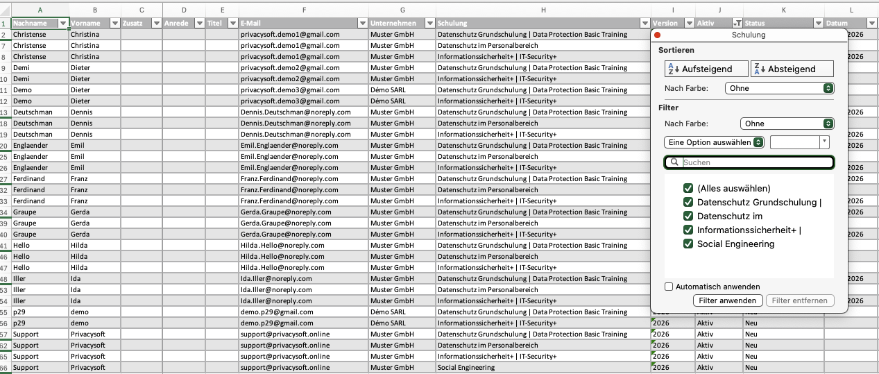 Im Tabellenblatt Report können Sie sich gezielt einen Überblick über den Schulungsstatus einzelner oder mehrerer Schulungen verschaffen. Nutzen Sie dazu den Filter in der Spalte Schulung.